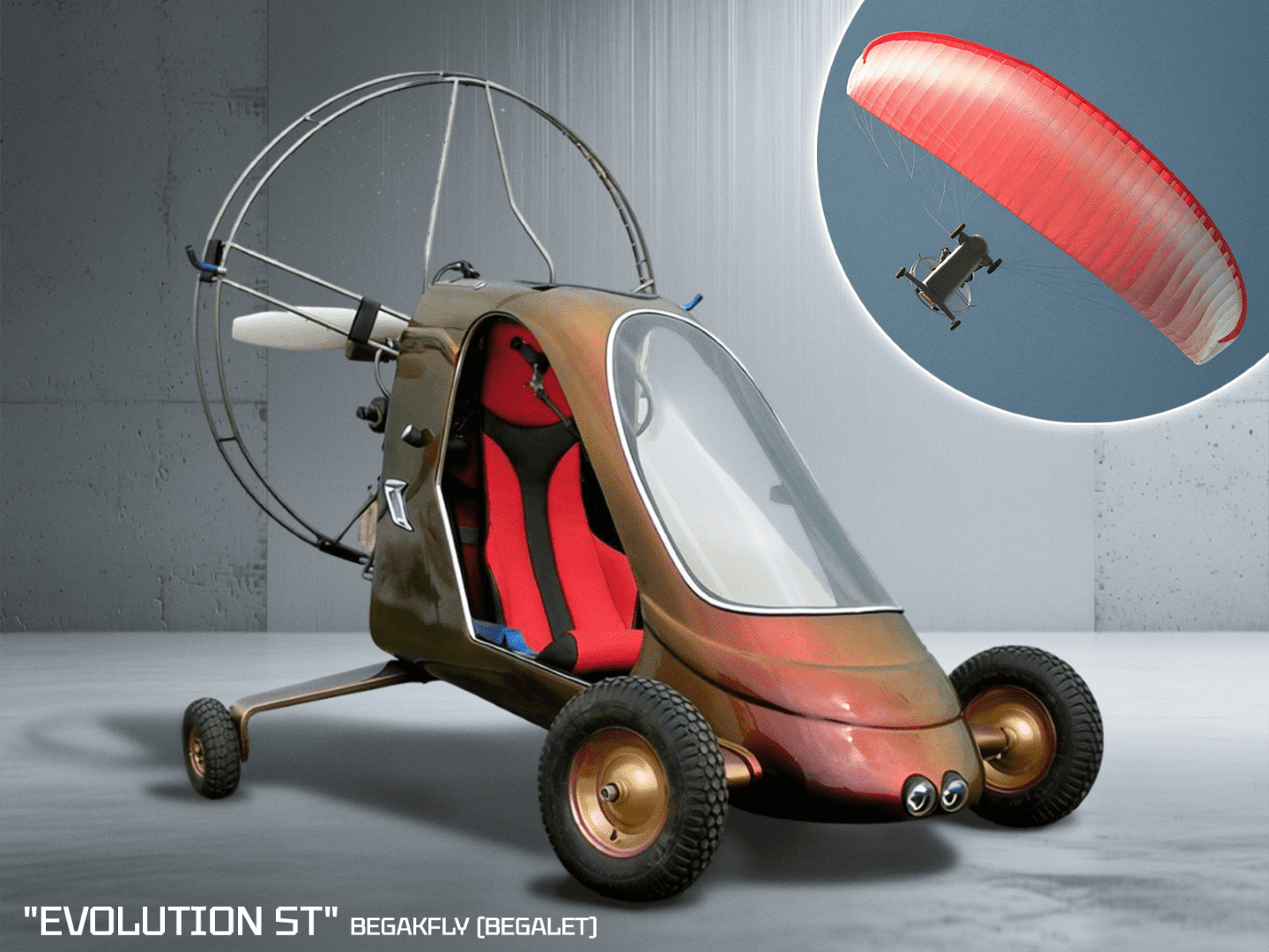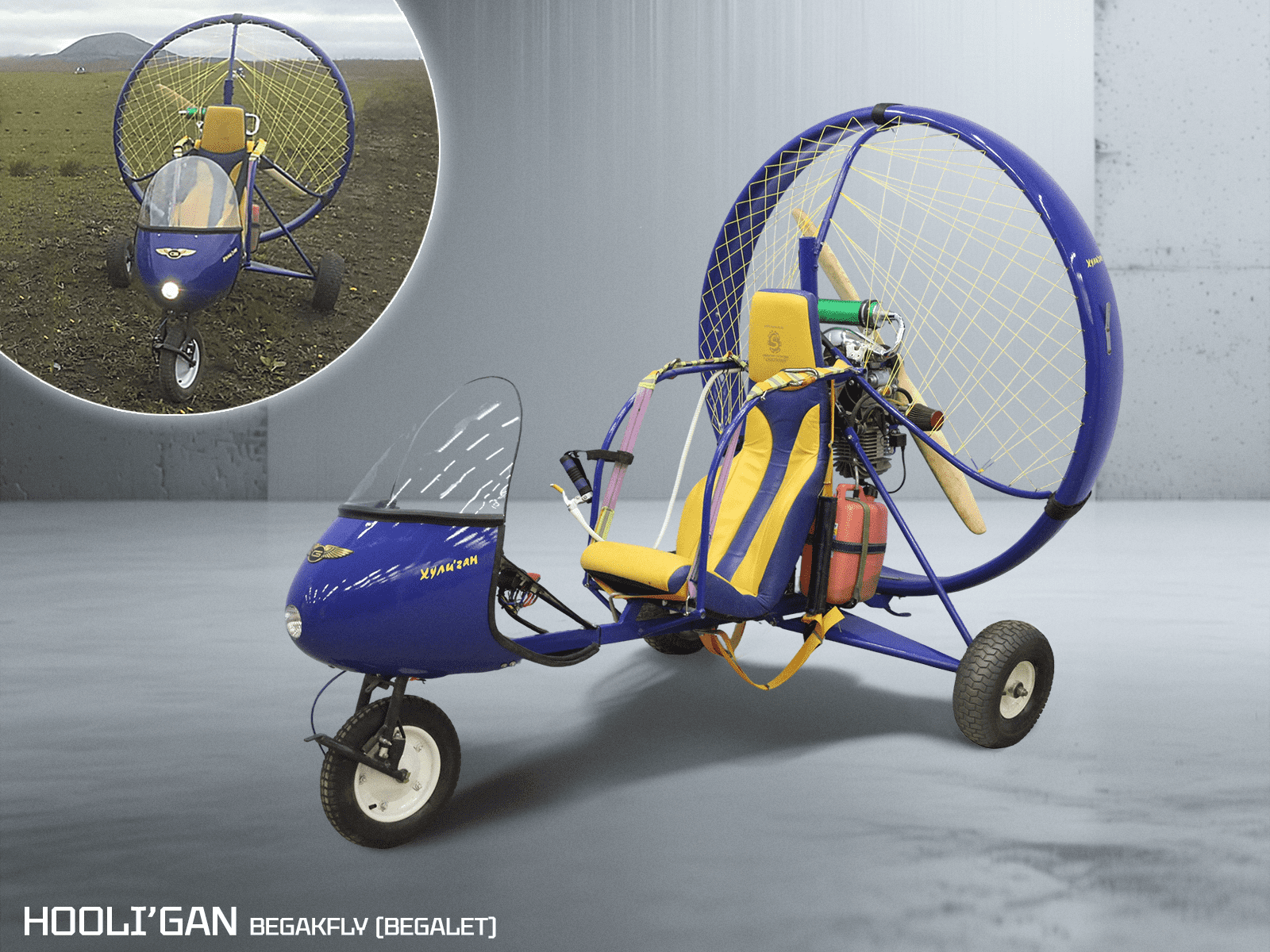 The Begalet has two modifications: 1. In the form of a parachute - with manual control of the canopy in the air. 2. In the form of an aerochute - with foot control of the canopy in the air.