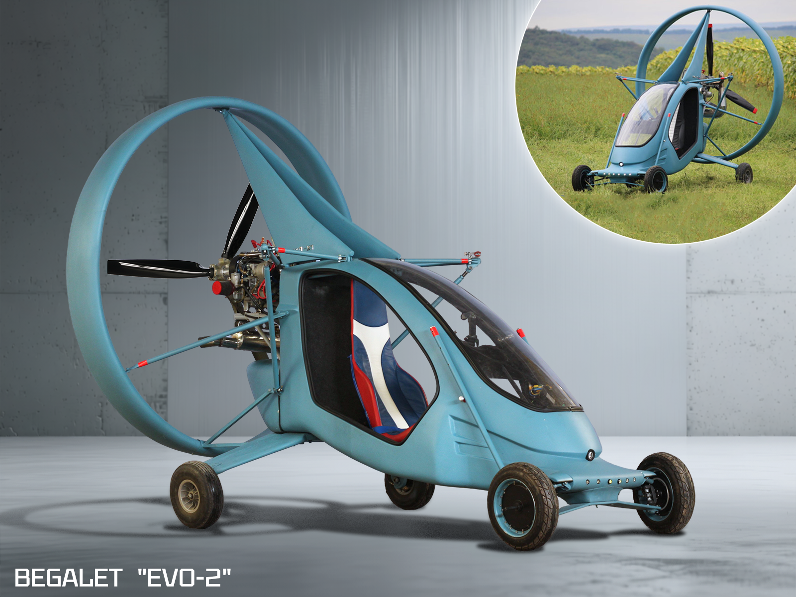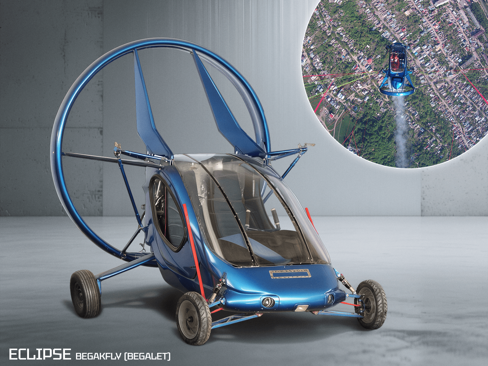 It drives on the ground like an electric car. All systems and the crew are housed in a streamlined cabin made of carbon fiber, basalt, and titanium. Twin controls.