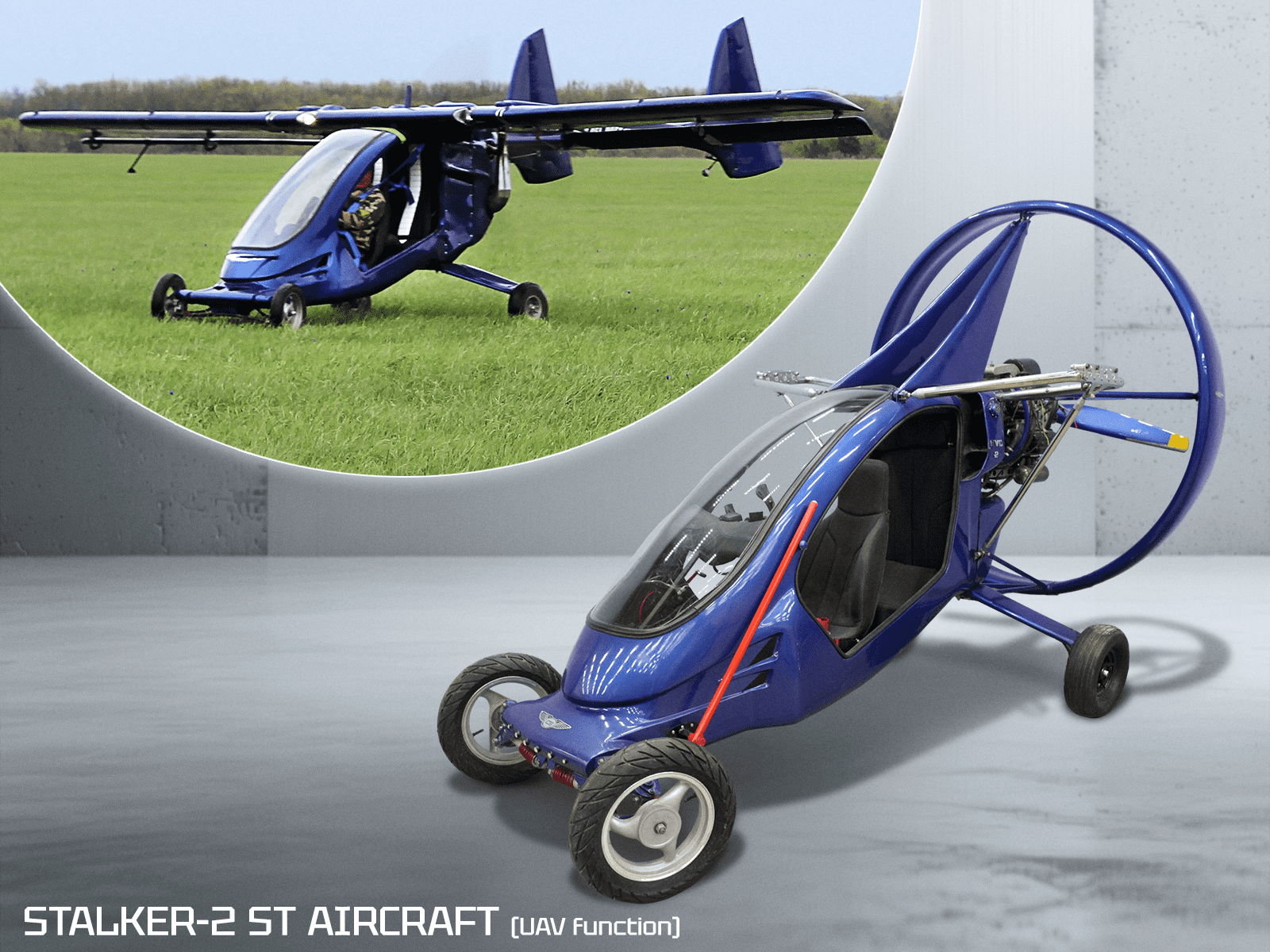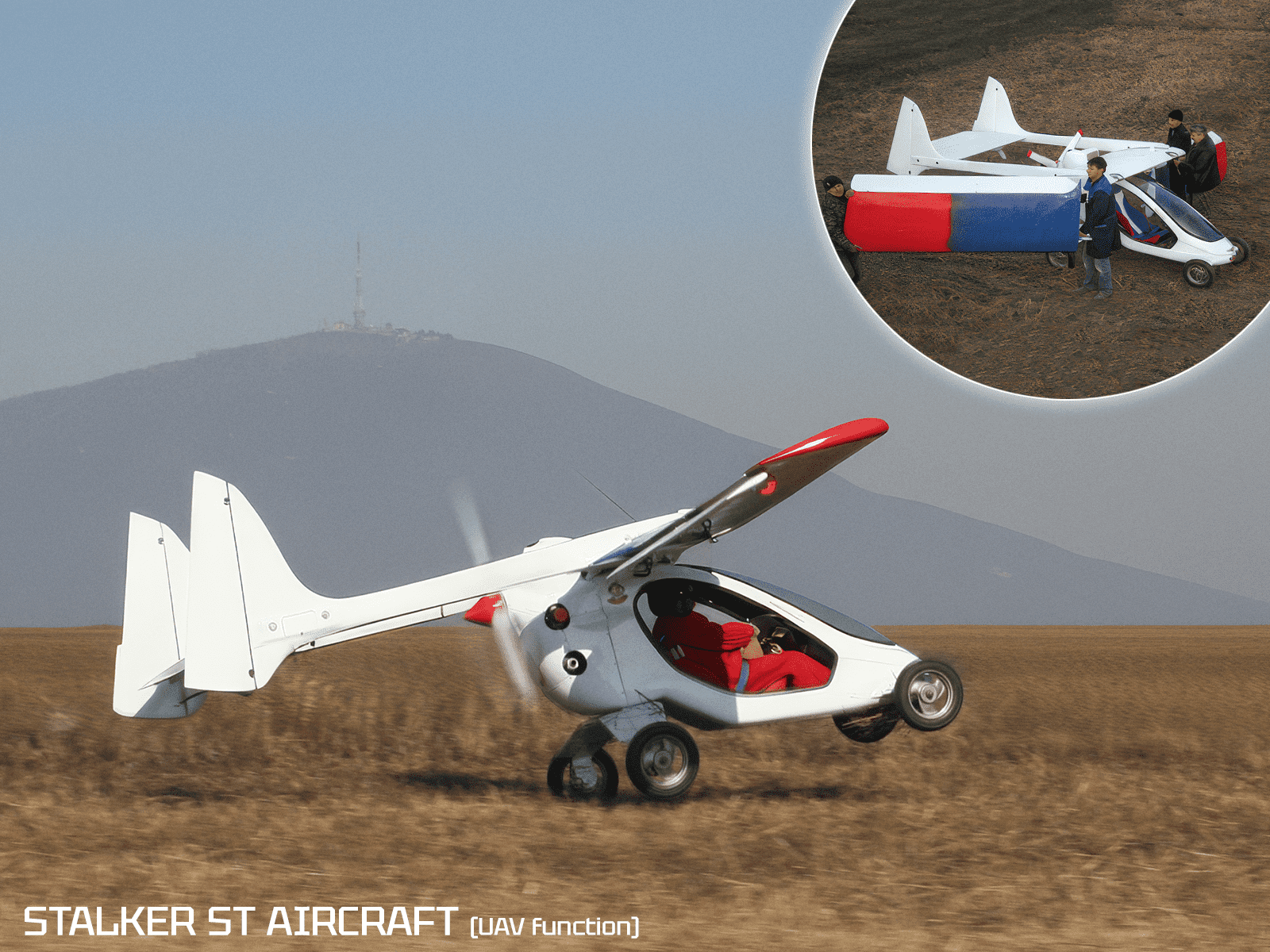 Optionally manned and unmanned single-seat composite aircraft with electric wheel chassis. Its wings fold along the body or are removed, which allows the device to easily travel on the road.